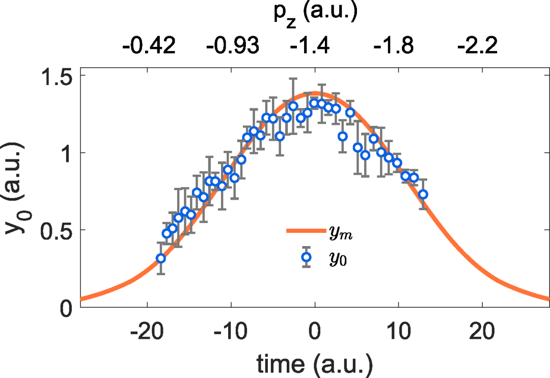 通过数值求解全维含时薛定谔方程,该工作证明了这一方案的可行性。图2展示由全息干涉图谱中提取的隧穿电离位置y0与从畸变波函数在隧穿出口位置处分布极大值的位置ym的对比。这两种结果符合的很好。这表明光电子全息的方法成功地“拍摄“了畸变中的波函数瞬时形态。