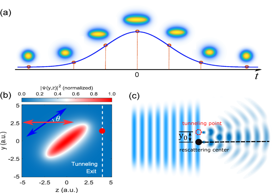 图1 (a)超强极紫外激光中电子波函数的绝热演化过程。(b)在激光场峰值处的畸变波函数。(c)光电子全息干涉的原理示意图。