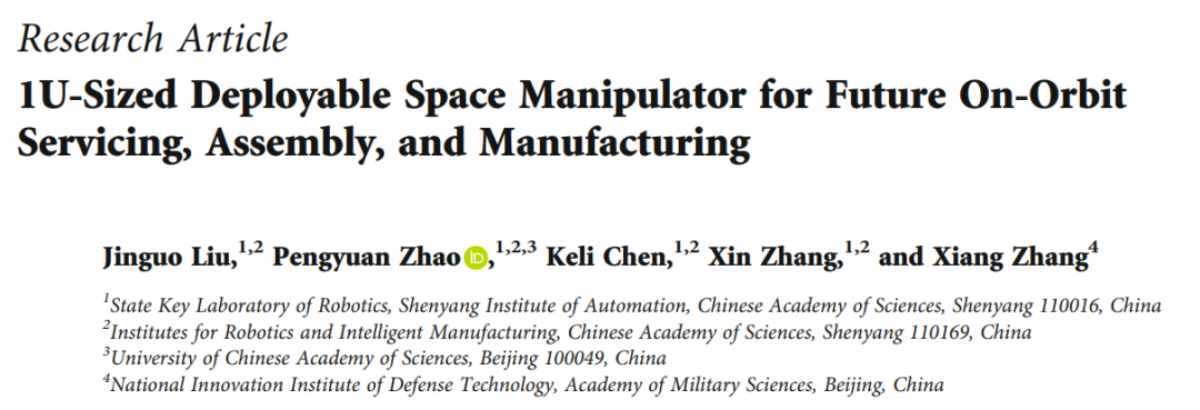Jinguo Liu, Pengyuan Zhao, Keli Chen, Xin Zhang and Xiang Zhang, 1U-Sized Deployable Space Manipulator for Future On-Orbit Servicing, Assembly, and Manufacturing, Space: Science & Technology, Vol. 2022, Article ID 9894604, 14 pages, https://doi.org/10.34133/2022/9894604.