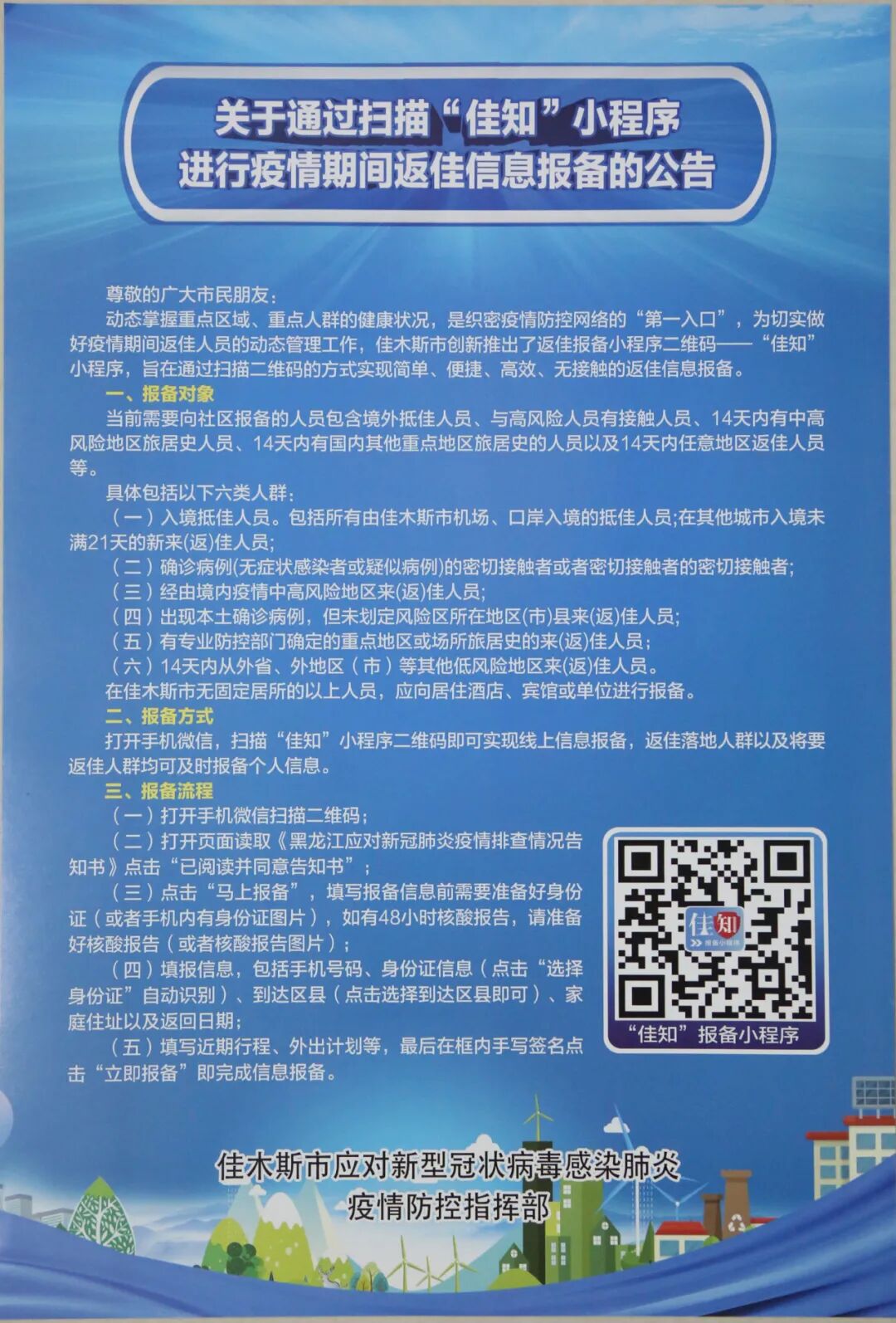 动态掌握重点区域、重点人群的健康状况,是织密疫情防控网络的“第一入口”,为切实做好疫情期间返佳人员的动态管理工作,佳木斯市创新推出了返佳报备小程序二维码——“佳知”小程序,旨在通过扫描二维码的方式实现简单、便捷、高效、无接触的返佳信息报备。