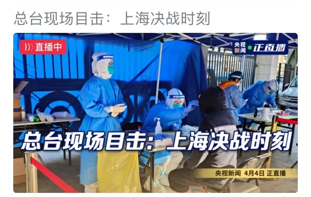央视新闻在4月4日开启《总台现场目击:上海决战时刻》直播,派出多路记者探访居民核酸检测现场、上海新国际博览中心方舱医院及配药送药、蔬菜配货等物资保障前线。该直播在央视新闻客户端点赞量过万、微博观看人次高达733万。