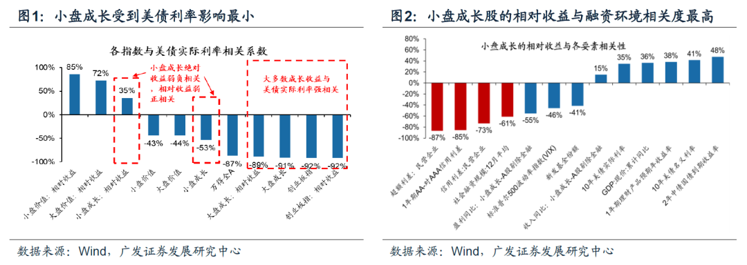 (三)“不卑不亢、大盘价值股迎来绝对收益之旅、战略看多小盘成长股”并不冲突。我们在5.15《不卑不亢,价值先行》提示:A股从前五个月的泥沙俱下(“慎思笃行”)转向具备较丰富结构性机会(“不卑不亢”)——中国政策经济预期最悲观的阶段已经过去,A股的核心矛盾转变为“美联储坚决紧,国内信用底已过”,A股估值比较便宜(尚未极度便宜),但由于美联储仍将鹰派,“复合政策底”尚未形成,因此A股“不卑不亢”,具备较丰富结构性机会。我们在5.18《小盘成长股的四条线索》和5.20《战略看多小盘成长股,如何优选?》建议:“积极优选”A股小盘成长股——自21年3月至今,我们对小盘股的观点经历了3个阶段:21年3月“市值下沉”→21年12月“小盘股面临估值陷阱”→今年5月强调小盘成长的决定性要素有明显改善,建议积极优选布局。“不卑不亢、大盘价值股迎来绝对收益之旅、战略看多小盘成长股”并不冲突——A股“不卑不亢”首要关注价值股,其次关注受美联储紧缩影响有限且交易结构不拥挤、前期超跌小盘成长股(500亿市值以下)。(1)价值先行:“宏观杠杆率会有所上升”信号明确,我们认为发力点在地产基建特别国债及传统国企低碳转型加杠杆。(2)战略看多小盘成长股:美债利率上行对A股价值股、小盘成长股的负面影响相对有限(下图1)。小盘成长股的决定性因素是国内信用环境(下图2)。我们认为民营企业的信用环境将得到改善,而小盘成长股经历了4月下旬的小型流动性冲击后有所出清,估值已经见底。