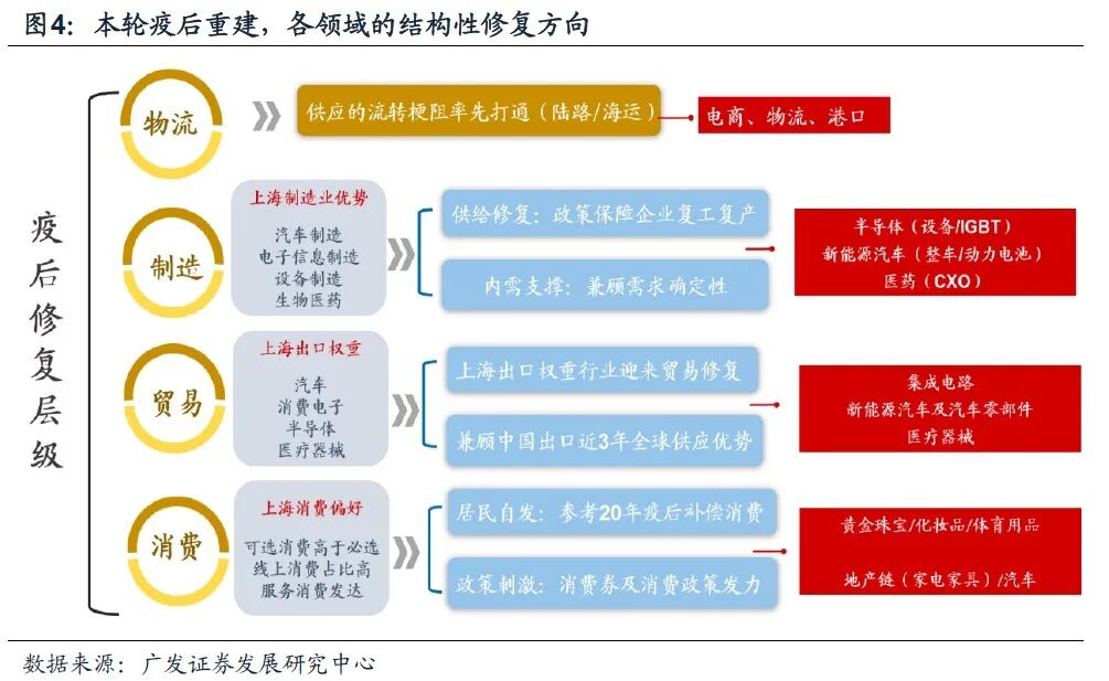 线索一:疫后复苏。按供需修复层级,聚焦上海制造业优势、贸易权重、消费偏好,本轮疫后复苏可关注如下领域: