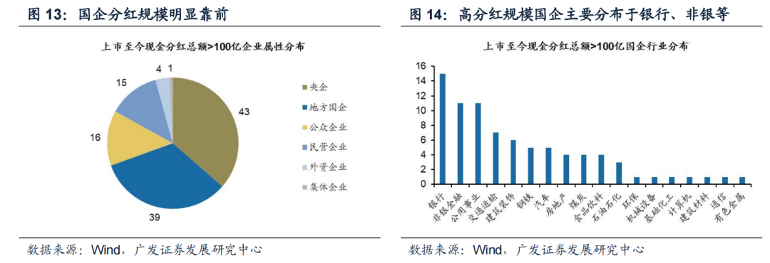 方向八:高现金分红国资委明确表态给上市国企现金分红提供积极指导支持,建议关注高分红国企(一般拥有周期类行业、现金流较好特征)。(1)从分红金额来看,比较上市至今现金分红总额大于100亿的企业属性,其中82家为国有企业,占比69.49%,主要分布于银行、非银金融、公用事业、交通运输等行业。而现金分红总额大于100亿的企业经营性现金流占比相对更优;(2)从分红率来看,上市至今分红率>100%的国企主要分布于公用事业、基础化工等行业。