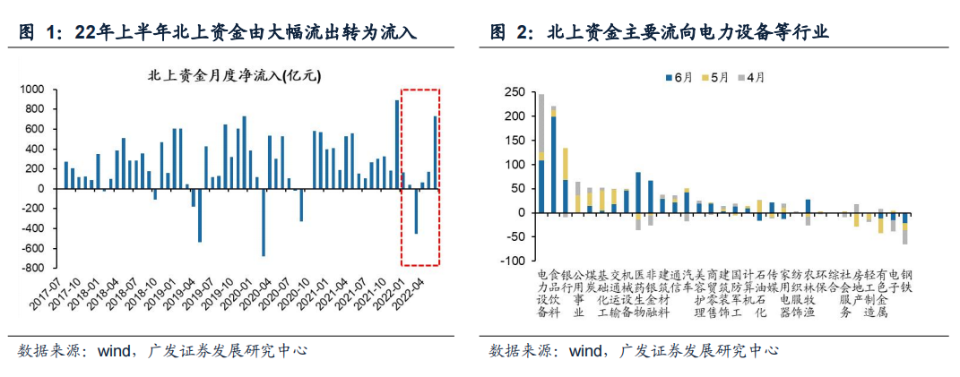 今年5月以来,在全球risk-off背景下,A股走出“独立行情”。其中最为重要的增量资金是北上资金的重新大幅流入。22年一季度,在地缘政治冲突风险加剧、美联储加息预期升温、金融去全球化担忧等要素共同作用下,北上资金呈现显著净流出,北上资金1-3月度累计净流出185亿元。而22年4月以来,伴随着疫情边际改善、政策暖风频出与海外金融条件收紧,北上资金流入规模逐月扩大,4-6月度净流入分别为84亿元、177亿元、743亿元。尤其是6月8日美国通胀预期恶化以来,北上资金在10个交易日内快速净流入660亿元人民币,6月初全年累计净流入实现由负转正。截止22年6月30日,22年北上资金累计净流入规模达735亿元。分行业来看,北上资金主要流入电力设备、食品饮料、银行等行业,流入前三行业的资金占北上资金流入总量的59%。