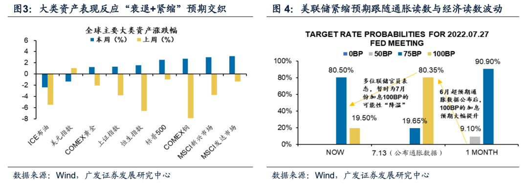 首先,海外仍是“衰退+紧缩”的两难窘境。1.近两周领先指标显示美国消费动能将继续走弱,而7月PMI创2年新低。(1)7.15公布的美国密歇根大学消费者预期指数持续恶化,由6月的47.5再度下调至47.3,处于历史极低水平;7.13公布的6月超预期通胀数据显示,高物价或将持续挤压消费购买力。(2)7.22公布的美国7月Markit制造业PMI为52.3,创20年7月以来最低,而服务业和综合PMI更是陷入收缩区间。2. 美联储七月加息75BP,欧洲央行宣布11年来首次加息。6月通胀数据公布当日CME预测数据显示7月加息100 BP的概率一度飙升至80%,随后多位联储官员表态及继续披露的疲弱数据暂时为7月份加息100BP的可能性“降温”;本周欧洲央行超预期加息50基点,也是欧洲央行自2011年以来首次加息。3. 近两周大类资产表现印证“衰退交易”与“紧缩交易”共振:“衰退预期”主导大多商品和美股下跌,“紧缩预期”支持美元走高、美债高位震荡。本周美联储进入决策会议前静默期而经济数据疲弱,大类资产较上周表现缓和,不过市场预期仍在反映“两难窘境”。