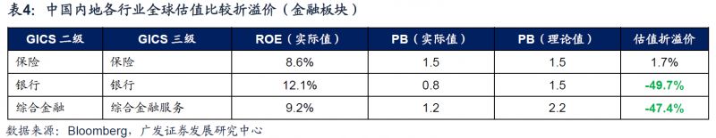 A股的金融板块整体偏低估,其中:保险的估值基本与全球接轨,银行和综合金融明显低估。