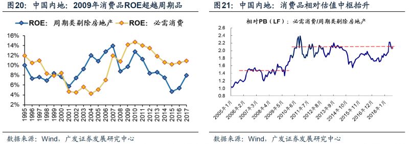 以中国内地为例,在消费升级的背景下,消费品的ROE中枢从2009年开始超越周期品,消费品相对周期品的估值中枢也随之明显抬升——以08年金融危机为界,周期品的ROE从持续回升步入持续回落阶段,而在消费升级的带动下,必需消费品的ROE却在持续抬升,并在2009年超越周期品;消费品相对于周期品ROE此消彼长的变化,带来消费品相对周期股估值中枢的显著抬升。