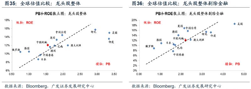 从龙头股盈利能力和估值动态平衡的角度来看:A股龙头整体的估值略低于全球水平,A股剔除金融龙头股的估值基本与全球接轨。