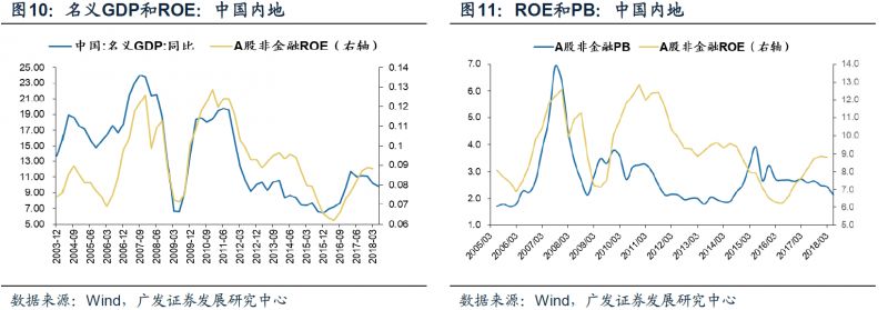 从宏观视角来看,一国上市公司的ROE和该国的名义GDP高度相关,同时,该国上市公司的ROE和相应的PB也具有较高的相关性。2000年以来的经验数据显示,中国内地、美国、日本、韩国主要指数的ROE和名义GDP具有很高的相关性,同时,主要指数的ROE和PB的走势也基本一致,即,ROE是链接宏观(名义GDP)和估值(PB)的桥梁。