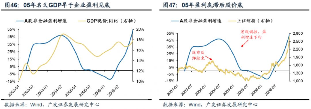 05年上半年货币政策转向宽松以及股份分置改革降低股权风险溢价带来的贴现率下行是A股熊转牛的初始动力。05年4月股权分置改革提升了风险偏好是A股走牛的核心驱动因素之一,叠加当年贸易顺差结汇带来超额流动性,上证综指在05年6月见底,名义GDP是在05Q3见底,而企业盈利是在06 Q1才见底,盈利底滞后了股价底三个季度,盈利并非牛市前半场的核心驱动因素,但却是牛市中场及后半程的又一核心驱动因素,相当于进一步夯实了牛市行情。