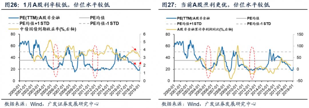 本轮底部估值比05年底部低10%,且本轮利率水平明显更低,盈利明显更优,考虑利率和盈利后,本轮估值水平相较05年明显更低。与05年3月估值底A股非金融PE(TTM)20x相比,18年12月估值底为18x,本轮估值低10%;18年12月10Y国债收益率约3.2%,05年3月则为4.1%,本轮底部利率水平比05年3月低约90bp;18Q3A股非金融累计净利润同比增速预计为17%,05Q1仅为2.6%,当前盈利明显更优。