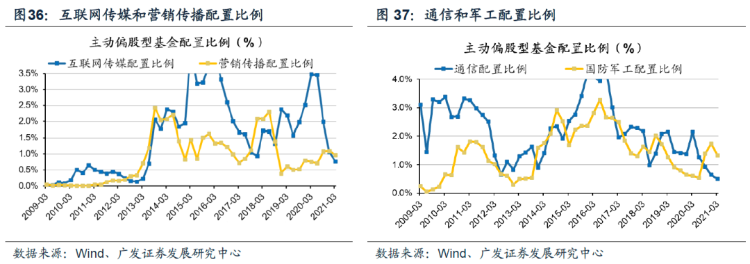 通信配置继续回落。通信配置从20Q4的0.6%继续下降至0.5%,延续四个季度减配,主要减仓通信设备。