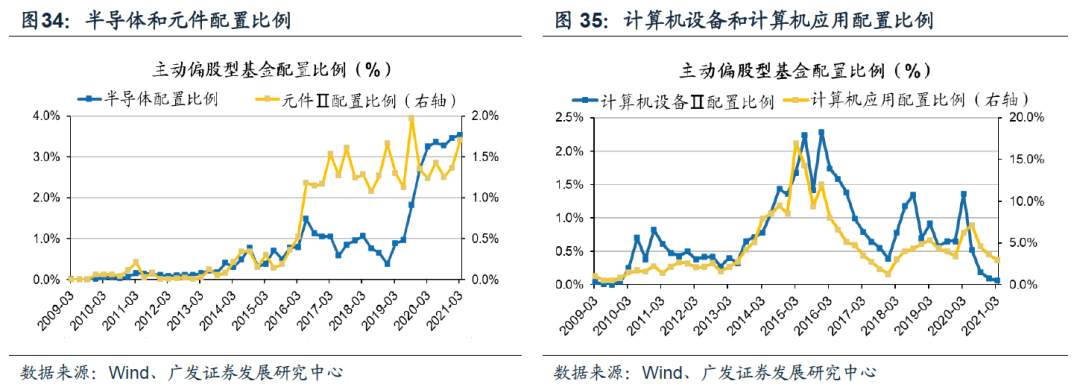 “出口链”景气使纺织服装、家具等成为基金加仓的方向。纺织服装较20Q4上升0.1pct至0.2%,家用轻工配置连续3个季度上升至1.1%,家电(主要是白电)相比20Q4下降0.8pct至3.8%(超配0.8%)。