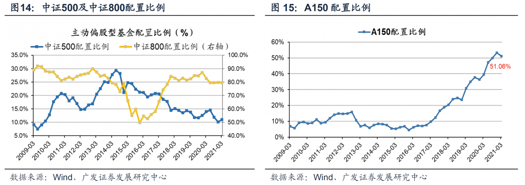 对中证500的配置比例小幅上升,但基金重仓股维度的“市值下沉”尚不显著。对中证500的配置比例由20Q4的10.1%上升至11.0%(低配4.2%);对中证800的配置比例由20Q4的79.7%降至79.5%,超配9.1%。
