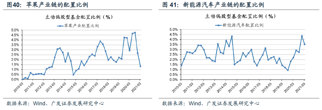 21Q1新能源汽车的配置比例小幅下降;苹果产业链配置比例自高点连续2个季度回落至16年以来低点。