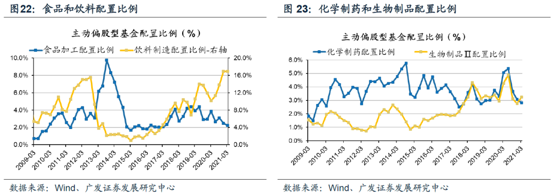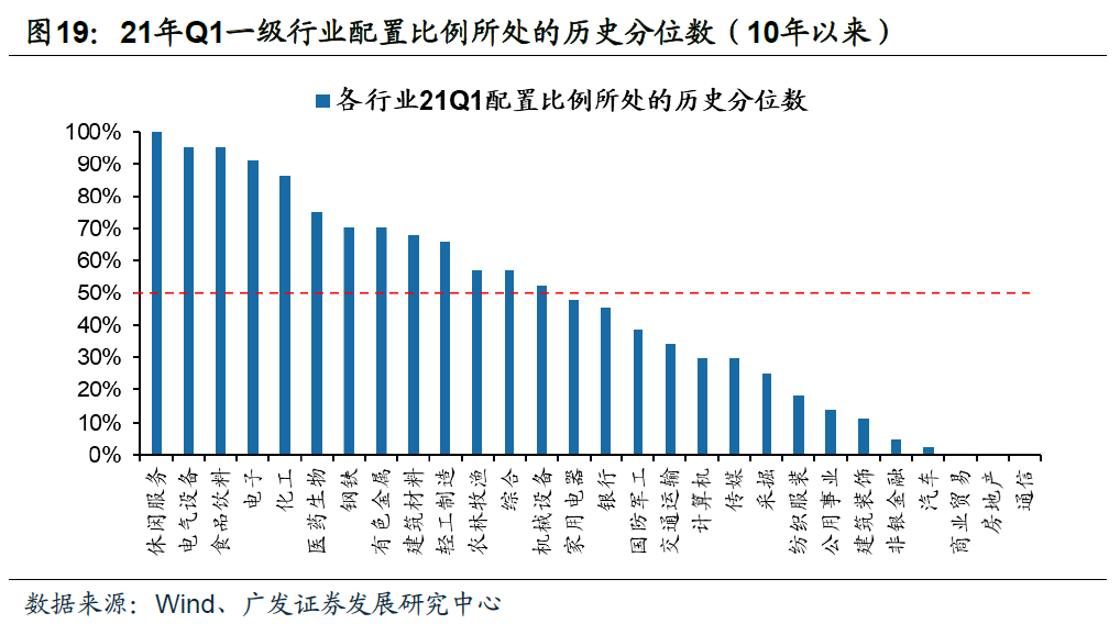 21年Q1主动偏股型基金主要加仓金融服务、农业以及必需消费,而对服务业、中游制造、可选消费、TMT以及资源类的配置比例下降。
