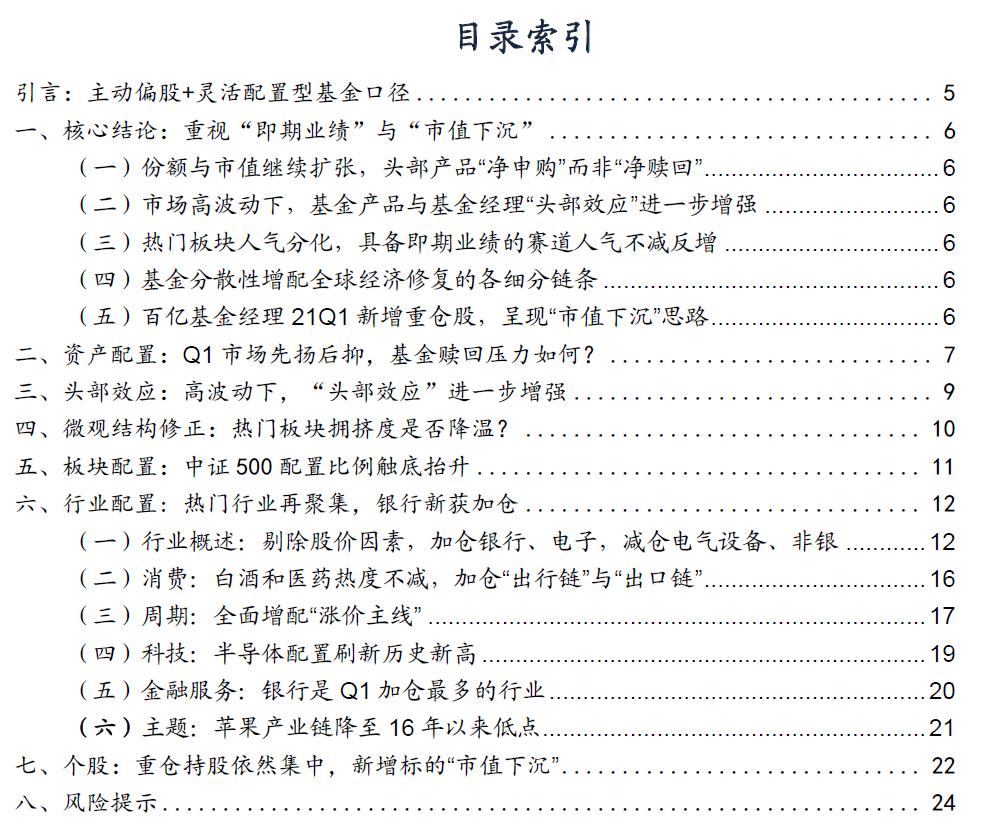 下文不做特殊说明,我们所示的仓位、份额、市值等数据口径的“上升”“下降”均指21Q1较20Q4的变化情况。我们所示的行业均为“申万行业分类”。