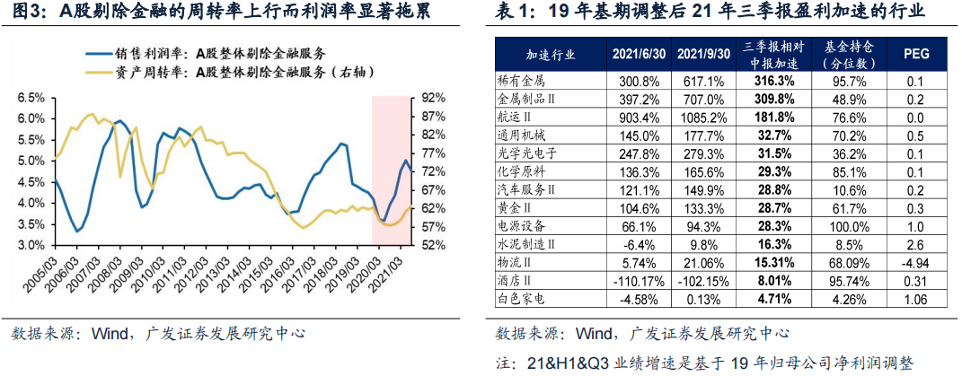 (二)A股三季报披露完毕,盈利亦呈现下滑态势,A股非金融的三季报单季盈利增速落至负增长区间。我们在10.30《剔除基数效应,A股盈利小幅回落》中对A股三季报情况作出速览,几个值得关注的要点如下——1. 剔除基数效应,A股盈利小幅回落,用19年净利润基期调整计算21三季报累计净利润同比增速:A股整体三季报归母净利润(下同)同比增速19.10%(中报利润同比增速19.2%);A股剔除金融三季报利润同比增速35.2%(中报利润同比增速38.1%)。2. 受到利润率的拖累,A股非金融ROE小幅下行,三季报ROE(TTM)为8.98%,相对于21中报的9.29%下行,主要受到了成本挤压带来的毛利率与销售利润率的拖累;3. 以19年基期调整,三季报盈利增速较中报加速的行业主要集中在三条线索。第一是上中游的部分涨价周期品(钢铁/稀有金属/化学原料/化学制品),第二是科技及高端制造业(光学光电子/电源设备/通用机械),第三是部分可选消费及服务业的景气触底改善(白电/酒店/物流)。4. 以19年基期调整,三季报较中报盈利明显减速的行业,主要集中在农业(畜禽养殖/饲料/农产品加工)以及中游制造(造纸/塑料/玻璃制造/电力)等。