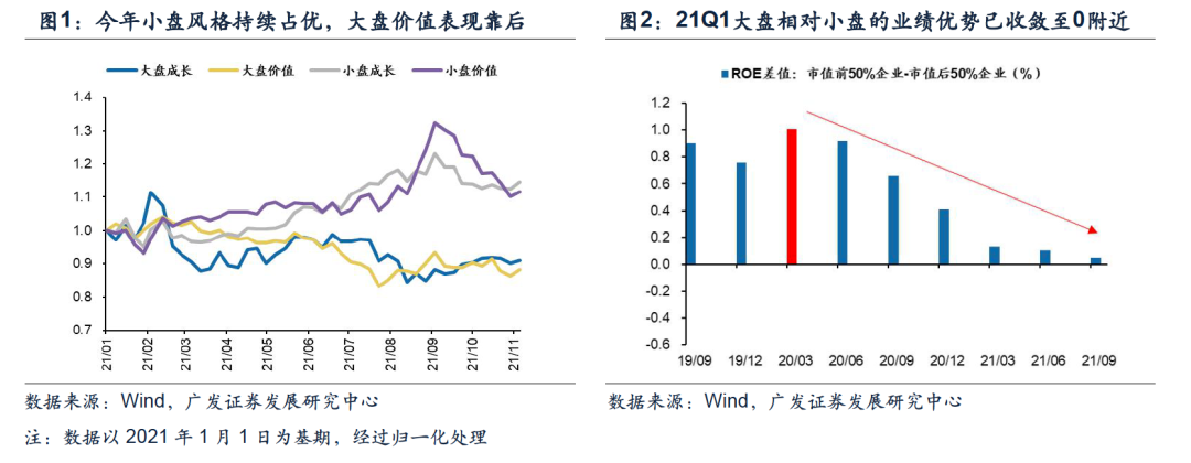 今年的风格轮动带给我们什么启示?我们自今年2月提出“市值下沉”以来,小盘风格整体占优,大盘表现较为落后。除了“市场微观结构恶化”给我们带来的信号意义以外,小盘股与大盘股之间的“相对业绩优势”是主导今年风格切换的核心:我们将A股非金融市值规模前50%的个股视作大盘股,后50%的个股作为小盘股,采用整体法计算两个股票集合的ROE,并通过差值来反映大小盘股的相对业绩优势。实际上,2020年2季度开始,大盘相对于小盘的业绩比较优势已经开始收敛,2021年则进一步回落,最新的三季报数据显示两者的差值已处于0附近。因此今年以来,小盘股业绩弹性更高、增长更快,相对大盘股的业绩有比较优势,是驱动本轮风格切换的关键。