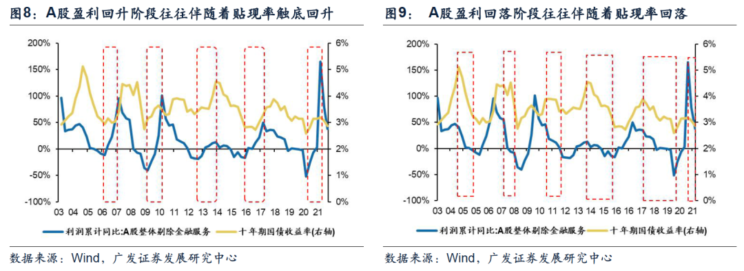 央行调控下的宏观周期性波动将企业盈利与利率联系起来。现象上,2003年以来A股的盈利周期与利率周期存在较强的正相关性,表现为每一轮盈利上行的阶段都伴随着利率的触底回升,下行期利率也见顶回落。逻辑上,上市公司盈利周期与宏观经济周期基本一致,而利率作为央行调节经济增长的核心政策目标之一,具有“逆周期”属性,由此导致企业盈利上行阶段(经济复苏)利率抬升,盈利下行阶段(经济衰退)利率下降。具体来说: