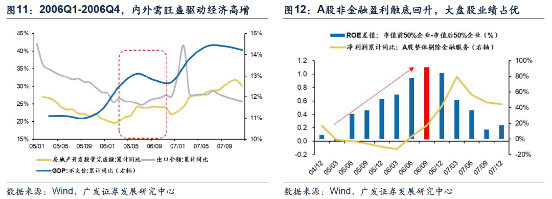阶段一:2006Q2-2006Q4,经济高速增长,企业盈利扩张,大盘价值相对业绩优势扩大。2005年的汇率制度改革给人民币带来持续升值压力,央行为此进行大量基础货币投放,充裕的流动性支撑了包括房地产在内的固定资产投资扩张;同时全球经济回暖和加入WTO的开放红利使得出口维持高景气。内外需旺盛带动经济自2006年初触底回升,A股剔除金融盈利增速也于06年1季度见底。由于经济复苏早期对物流、基础设施和原材料等环节需求旺盛,大盘股相对小盘股的盈利优势早在2005年2季度开始便持续扩大,直至2006年底。2006年2季度至2006年底,在相对业绩优势的驱动下,市场风格逐渐转向大盘价值。