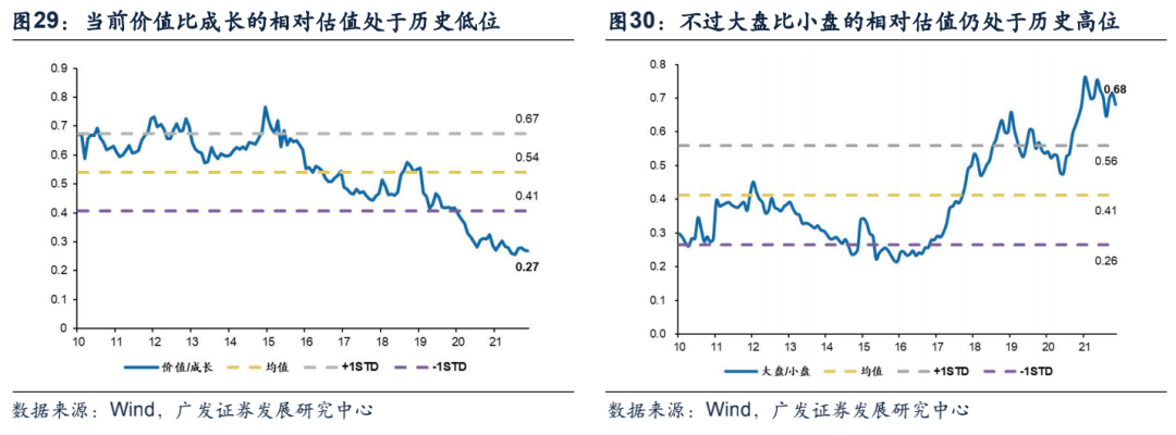 (1)价值相对于成长的估值处于历史低位,大盘相对于小盘的估值高位回落。从相对估值的角度来看,价值风格相对于成长风格的估值自2015年以来趋势性下滑,目前已处于2010年以来最低的水平。大盘相对于小盘的估值目前依然不低,反映2020年2季度以来,小盘股的相对业绩优势对相对估值有比较明显的消化作用。不过今年年初以来,随着市场的调整,大盘相对于小盘的估值也已经从高位开始回落。