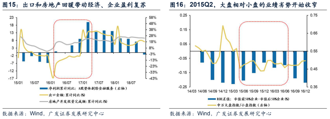 阶段一:2016Q1-2016Q2,经济与企业盈利触底回升,大盘股业绩相对劣势收窄。2015年房地产利好政策频发,首付款比例最低下调至25%,42城市取消限购令。央行5次降息降准,贷款基准利率由6.15%降至4.9%,降幅高达25.5%。在相关政策的不断刺激下,房地产库存去化进一步加速,15年4季度商品房销售面积增速由年初的-16.3%提升至6.5%,带动房地产开发投资完成额自16年1月开始回升。由于海外需求复苏和人民币实际有效汇率走弱,出口在2016年2月见底回升。内外需双轮驱动下,2016年1季度经济呈现复苏态势,A股非金融累计净利润同比增速也同时触底反弹。本轮大盘相对于小盘的业绩相对劣势于2015年2季度开始收窄,2016年上半年基本维持稳定,申万大盘指数相对小盘指数的走势结束了自2013年初以来的下跌趋势,维持底部震荡。