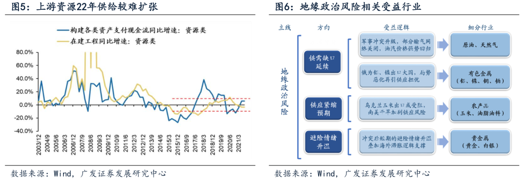 (三)俄乌地缘风险关注3条投资线索:俄乌冲突仍有较大不确定性,将强化全球资源/材料/农业的供给约束。当前俄乌双方谈判前景尚不明朗,军事行动仍在继续,且欧美对俄制裁潜在升级也有可能强化俄乌地缘风险的不确定性,并进一步约束全球资源/材料/农业等领域的供给约束。我们判断:俄乌地缘风险导致的全球供给约束担忧下,A股部分资源/材料行业22年的盈利能力(预期)有望维持高位韧劲——我们在年度策略展望《慎思笃行》中提示:“供需缺口”涨价顺周期是21年的3大贝塔之一,22年随着产能周期步入“投产”阶段,将会迎来结构性“供给过剩”。不过,在18年以来的“供给收缩常态化”政策约束下,资源和部分原材料行业的产能周期基本被“熨平”,22年供给较难扩张(下图5),全球供给约束将延续中国的资源/材料行业的“供需缺口”和价格韧性。建议关注俄乌地缘风险相关的3条投资线索——(1)“供需缺口”延续的大宗商品(石油、天然气)和有色金属(铝、钾、铜):随着军事冲突延续及潜在的欧美制裁,全球油气供应紧缩担忧,将支持石油、天然气等大宗商品价格。同时,18年美国对俄铝的制裁事件导致国际铝价创7年新高,若22年新一轮制裁落地,也可能进一步扰乱全球金属资源供应链,将支撑铝、钾、铜等有色金属价格。(2)供给收紧担忧的农产品(玉米、油脂油料):今年南美干旱天气引发大豆、玉米等减产,叠加俄乌地缘风险潜在升级的担忧,乌克兰玉米出口可能受阻,供给约束将会支撑全球玉米、油脂油料等农产品价格。(3)受益于避险情绪升温的贵金属(黄金、白银):俄乌地缘风险的不确定性扰动下,避险情绪有可能再次升温,叠加美国1月CPI再创80年代以来新高,海外滞涨逻辑共振将继续支撑黄金等贵金属价格。