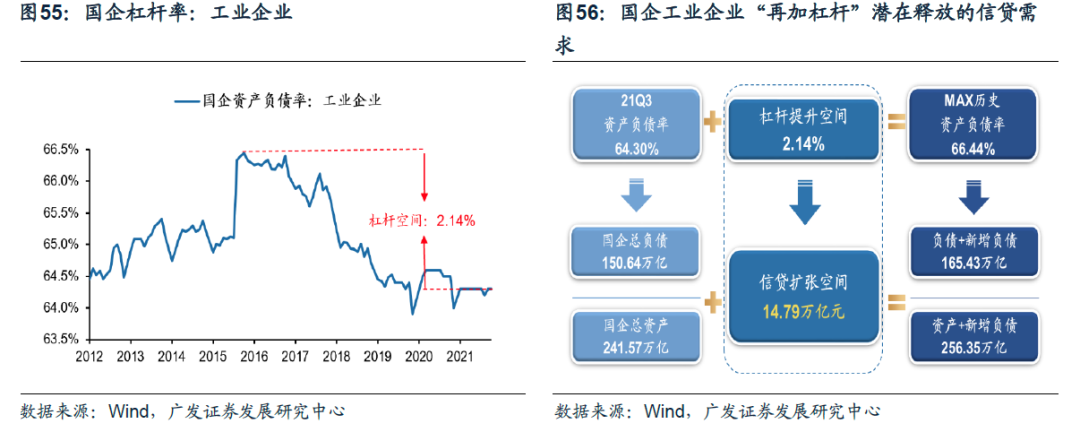 (2)经测算,在工业企业层面,如果国企的杠杆率加回到16年的相对高点,则将释放总计约15万亿的信贷需求。在上市公司层面:如果建筑装饰/公用事业/钢铁/化工/有色5大行业的杠杆率加回到10年以来的相对高点,大致能释放6.74万亿信贷需求。我们判断:国企传统产能“低碳转型”既是碳中和“后破”的主要方向,也是“稳增长”宽信用的关键线索,建议聚焦国企传统产能“低碳转型”的5大领域:建筑(装配式建筑)、公用事业(绿电)、钢铁(特钢)、化工(煤化工和新能源材料)以及有色(再生铝和有色小金属)。