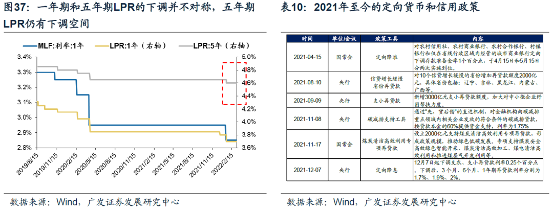 货币方面:“加大稳健的货币政策实施力度”政策指导下不排除再次降息。政府工作报告中首提“加大稳健的货币政策实施力度”,在宽信用的政策基调下,货币政策需要稳中求宽。同时,政府工作报告中还提到“发挥货币政策的总量和结构双重功能”,着重强调了货币政策的结构性作用,预计未来将持续出台定向普惠措施、定向降息降准等定向货币政策,定向重点支持小微、“双碳新周期”、农业等方向。在本次政府工作报告“降低实际贷款利率”的要求下,未提“继续引导金融系统向实体经济让利”,因此如果要达到实际贷款利率下降还需要降息或降准等方式配合,以降低金融机构的负债成本。前期1年期和5年期LPR的下调并不对称,当前5年期LPR仍有下调空间,不排除未来央行对LPR甚至MLF进一步降息的可能。