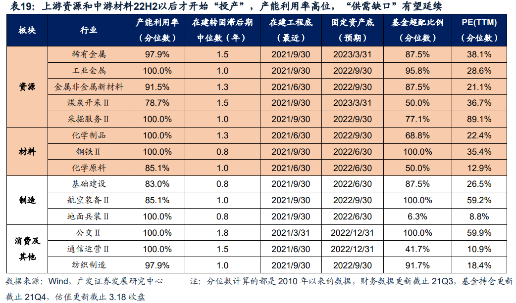 地缘风险加剧“供需缺口”:22H2产能才开始“投产”,且产能利用率高高位的资源/材料(煤炭/有色小金属/化工制品)。在二级细分行业中,我们筛选供给相对“刚性”的行业:预计产能22H2之后“投产”、产能利用率(2010年以来的分位数)高的细分行业,这些行业主要集中在资源和材料等领域。从供给端来看:地缘风险升级强化全球行业供给约束,A股部分资源/材料行业“供需缺口”有望延续;而从需求端来看钢铁行业延后碳达峰提升煤炭需求、新能源车高景气强化有色小金属/化工制品需求。