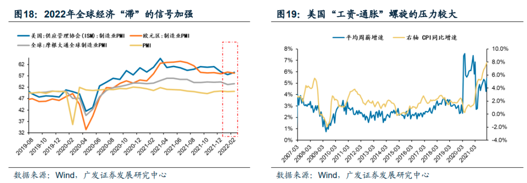 2022年海外“滞胀魅影”的信号进一步增强:(1)全球制造业PMI高位缓慢回落;2)2022年2月欧元区、美国CPI同比增速分别为5.9%、7.9%,分别创出有数据(1997年)和1982年以来新高;3)地缘政治风险加剧滞胀压力。俄罗斯和乌克兰出口商品主要为资源品和原材料,替代难度较大会增加商品如原油、铝、小麦等价格上涨带来的通胀压力。