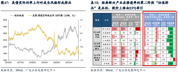 22年成长风格的走势与美债更相关。“渗透率”框架亦指向新兴产业周期迈向第二阶段后,将迎来估值挤压及业绩验证。