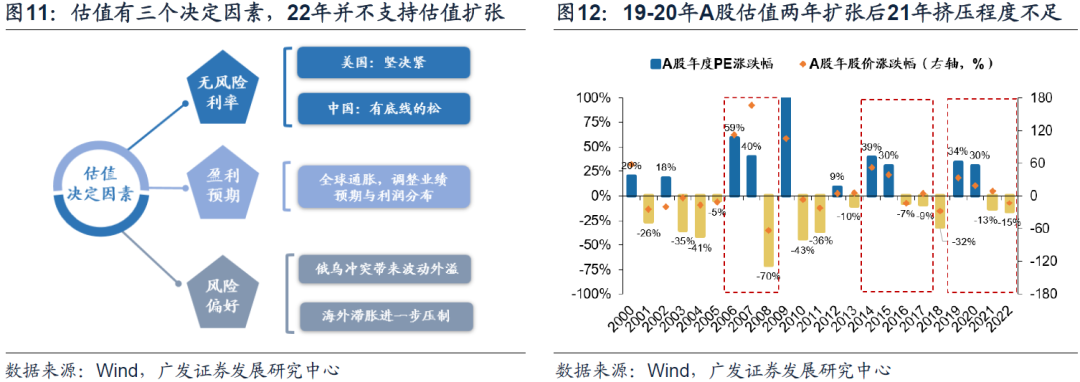 站在21年12月,22年A股企业盈利收缩至小幅正增长已经是市场共识,关键是估值的方向怎么走。主流研究沿用货币信用的策略框架,误判只要货币信用条件友好,A股估值就会上行。但是我们在之前的报告中指出:估值由三因素决定,(1)实际无风险利率—今年的利率逻辑在海外滞胀的制约和中国有底线宽松之间徘徊,接下来也面临美联储快速紧缩和中国宽信用的制约;(2)盈利预期—由于中国是高质量有底线的稳增长,信用扩张的力度将会偏弱,22年A股企业盈利预期从21年报高点大幅下滑;(3)风险偏好—海外滞胀全球流动性总闸门美联储加息+缩表,全球risk-off。可见,影响估值的三因素并不理想,连续两年估值扩张后,A股21年估值收缩仅13%左右,历史经验看收缩幅度不够。