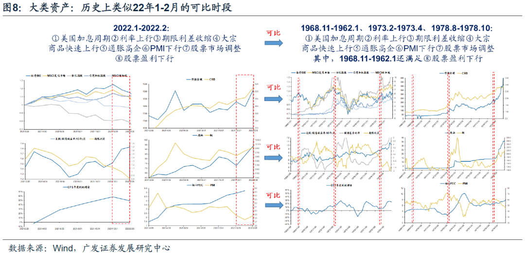 而短期维度来看,类似22年1-2月,时间区间在2个月+美国加息周期+利率上行+期限利差收缩+大宗商品快速上行+通胀高企+PMI下行+股票市场调整的区间,主要有3段:1968.11-1969.1、1973.2-1973.4、1978.8-1978.10。其中,1968.11-1962.1这一区间处在美股盈利下行的初期,与当前阶段极为类似。当前,美股盈利下行、PMI下行、全球通胀高企,而美联储3月议息会议更是显着下调了2022 年的 GDP 增长预测,“滞胀”特征愈发凸显。