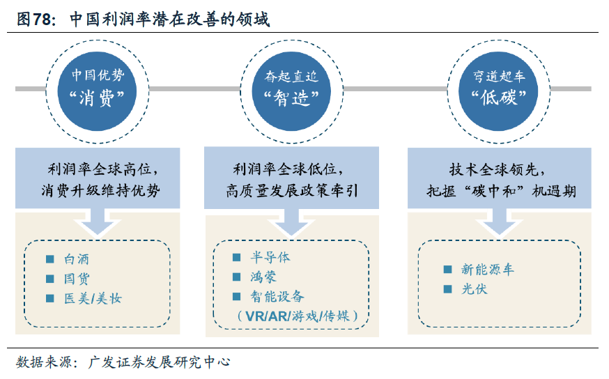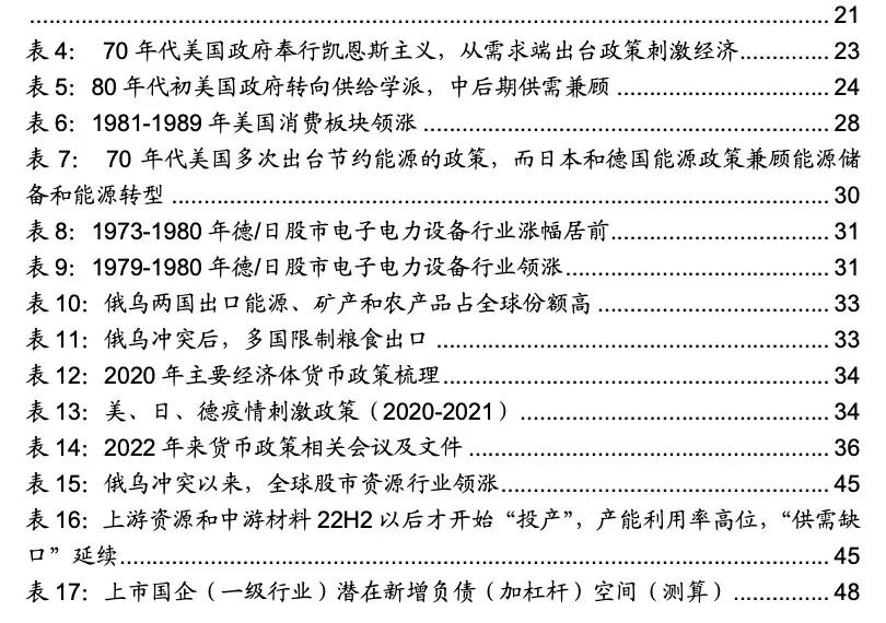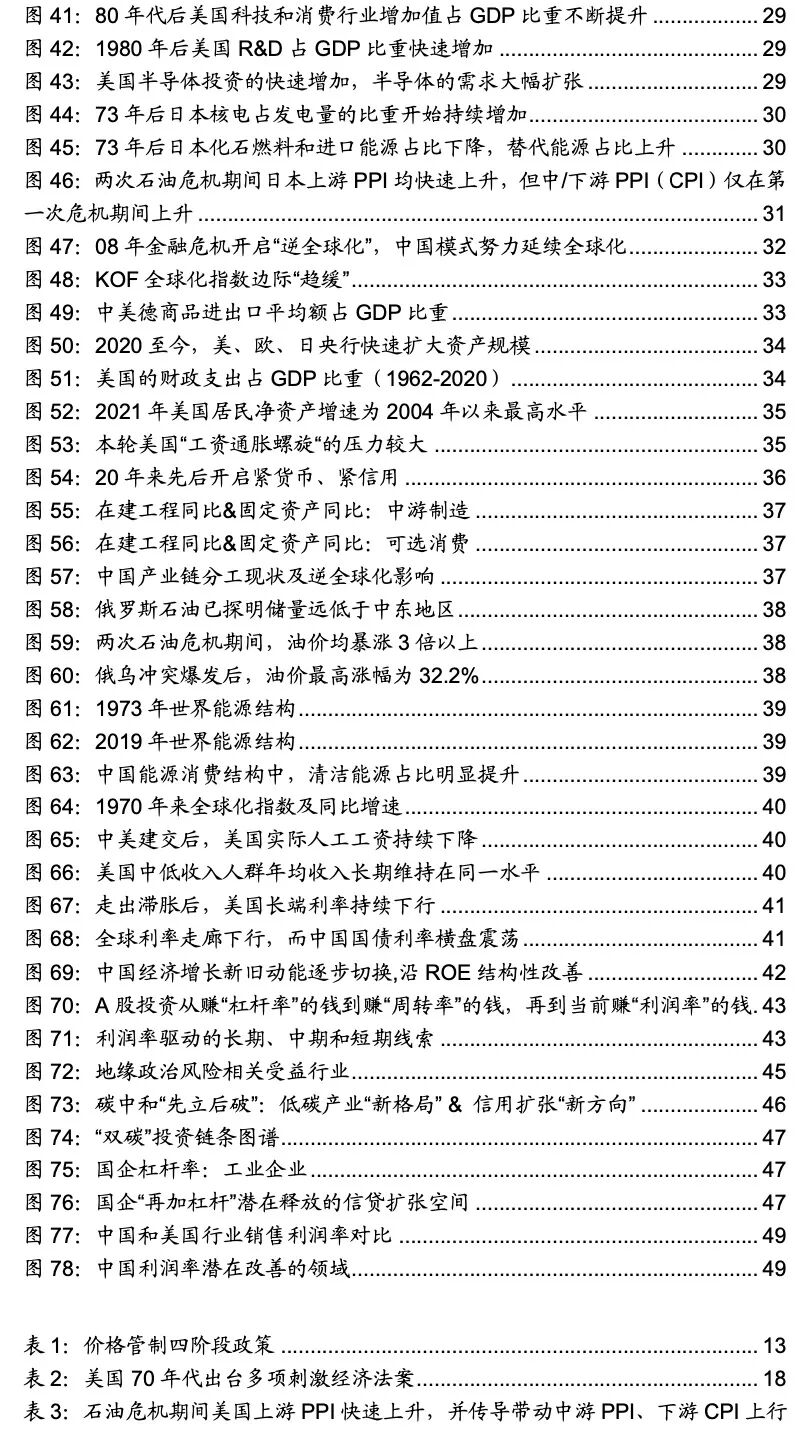 中国借鉴:中国经济新旧动能切换,正步入利润率驱动的“新动能”阶段,把握高质量发展主线,能够有效对冲海外滞胀压力。(1)短期聚焦通胀受益链条——18年以来的供给收缩常态化政策约束下,A股部分资源/材料行业的产能周期基本被“熨平”,22年供给较难扩张,本就处于“供需紧平衡”的状态。22年俄乌冲突加剧全球供给约束,预计A股资源/材料行业的“供需缺口”仍将延续,并继续维持价格和盈利韧性。(2)中期关注能源结构转型——70年代日本能源结构转型之后,第二次石油危机引发的滞胀,对中下游企业的冲击影响相对缓和。22年全球滞胀压力加大,能源结构转型既能有效缓和全球能源供给约束的不利影响,也能够带来中国经济增长的“新动能”,有助于中国率先走出全球滞胀周期:碳中和“先立”新能源抢占全球高端制造“先发优势”,碳中和“后破”传统能源低碳转型布局中低端制造业低碳时代的“竞争优势”。(3)长期把握产业结构转型(从杠杆率/周转率驱动,转向利润率驱动)——中国部分消费行业利润率领先全球,但科技制造业的利润率则相对落后,高质量发展主线下,消费、高端制造、低碳等行业的利润率有望迎来中期改善,并形成中国经济发展的“新动能”。