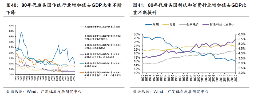积极拥抱全球化趋势,消费/科技的“高质量发展主线”,才是80年代美国经济走出滞胀的本质。整个70年代全球处于“苏攻美收”阶段,中美在苏联霸权主义的共同压力下,于1979年正式建交。KOF全球化指数也显示:1979年中美建交之后,中国和美国的全球化指数均显著改善。我们判断:80年代初美国积极拥抱全球化,将中国纳入美国主导的全球供应链系统,有效降低了美国各要素的生产成本(美国工人的实际薪资在整个80年代都是趋势性回落的),缓和了美国经济的滞胀压力。同时,得益于80年代里根政府对全球化和科技创新的积极推动,美国的产业结构也出现了质的飞跃,传统制造业的比重继续回落,而消费(全球化)和科技(高端化)行业的比重则明显抬升。我们认为:利润率驱动的消费/科技产业结构变迁,逐步形成美国经济增长的“新动能”,使得美国经济走出滞胀,迎来中期复苏,并造就美国股市80-90年代的消费长牛和2000年以来的FAANG科技长牛。