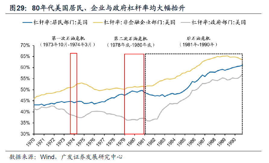 美国70年代“供给不足+需求刺激+石油危机”导致滞胀,80年代“增加供给+兼顾需求+高质量发展”走出滞胀。(1)70年代美国政府奉行凯恩斯主义,从需求端刺激经济增长,经济管控措施也反复无常;而供给端动能不足,制造业全球竞争力不足;此外,长期的高福利推高失业率,约束供给端;叠加货币超发,通胀水平持续恶化。两次石油危机使美国的恶性通胀恶化为滞胀。为应对利润率的下滑,美国全产业链从杠杆率(政府投资)驱动周转率(全球化)驱动利润率(高质量发展)驱动。(2)80年代美国政府转向增强供给为主,并兼顾需求,同时合理控制货币量,经济增长不以通胀为代价,美国走出滞胀。同时,在消费升级和科技革命的加持下,美国的产业结构向科技和消费转型,利润率驱动的高质量发展主线下,美国股市迎来80-90年代的消费长牛以及2000年以来的FAANG长牛。