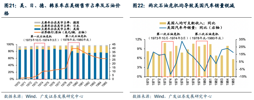 制造:石油危机造成能源约束,重创以汽车为首的美国制造业。由于原油价格飙升,“节能”成为衡量工业产品的重要维度,美国企业面对转型难题。与美系车辆传统的高能耗、大排放特点不同,日系车具备较高燃油经济性,在能源短缺背景下得以顺利进入美国市场并挤压美企市场份额。在1970年至1981年间,日系车在美市占率不断提升,美国车企出于生存压力开始转向生产更为经济的车型,研发开支增加。同时,石油危机带来车辆燃油价格陡增导致全美境内汽车销量锐减。由于日常油价高企,居民购买汽车的意愿减弱,两次石油危机均直接造成美国汽车年销量增速放缓,并在1974年和1980年出现负增长。