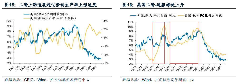 美苏争霸背景下,工会力量强大,通胀压力引发了工资-通胀螺旋上升。由于工会的存在,在不完全竞争的劳动市场上,工资脱离了劳动供求关系显示出很强的向上刚性。集体议价工资往往高于市场动态形成的工资,这使得工资上涨幅度超过了劳动生产率的上升速度,厂商的生产成本因此大幅增加。其结果必然迫使厂商通过直接或间接(降低产量,压缩供给)的方式提高产品价格,向消费者转嫁工资成本。同时,在物价普遍上涨后,工会又要求增加工资,再次引起物价上涨,通胀开始自我反哺。