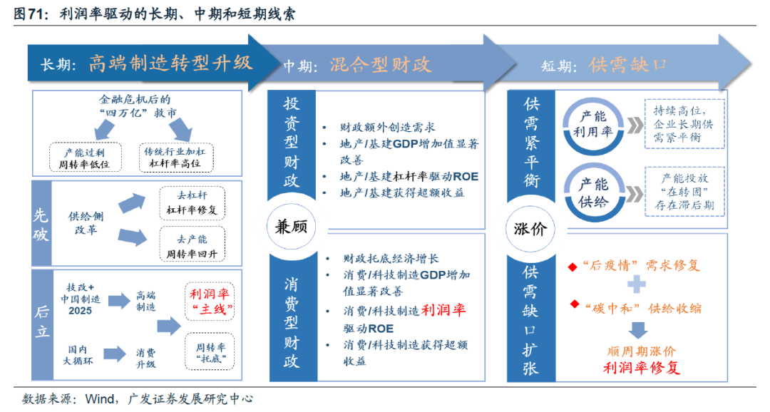 供给约束是70年代滞胀的主要成因,滞胀导致生产成本上行侵蚀企业盈利(利润率),美国政府在80年代转向供给学派,消费/科技牵引,经济复苏。美国70年代滞胀的成因:供给不足、货币超发、需求刺激、石油危机——(1)经济活力不足缺乏内生动能,制造业国际竞争力下滑;(2)货币超发叠加财政刺激推高通胀,强势工会加剧工资-通胀螺旋;(3)两次石油危机雪上加霜。美国70年代滞胀的影响:进一步削弱制造业全球竞争力(约束利润率)——70年代至80年代初期,美国经济整体下行,能源成本上升从上游向下游传导持续挤压企业盈利,使得制造业竞争力进一步削弱并开始“脱实向虚”。美国80年代走出滞胀:中美建交全球化加速降低要素成本 & 消费和科技行业引领高质量发展主线,改善企业盈利能力(提升利润率)——(1)80年代美国里根新政(供给学派)与沃尔克的紧缩货币政策,增加供给并降低要素成本;(2)79年中美建交,加速全球化进程,各类生产要素效率提升、成本下行;(3)美国消费/信息产业崛起,成为引领美国经济增长的“新动能”。