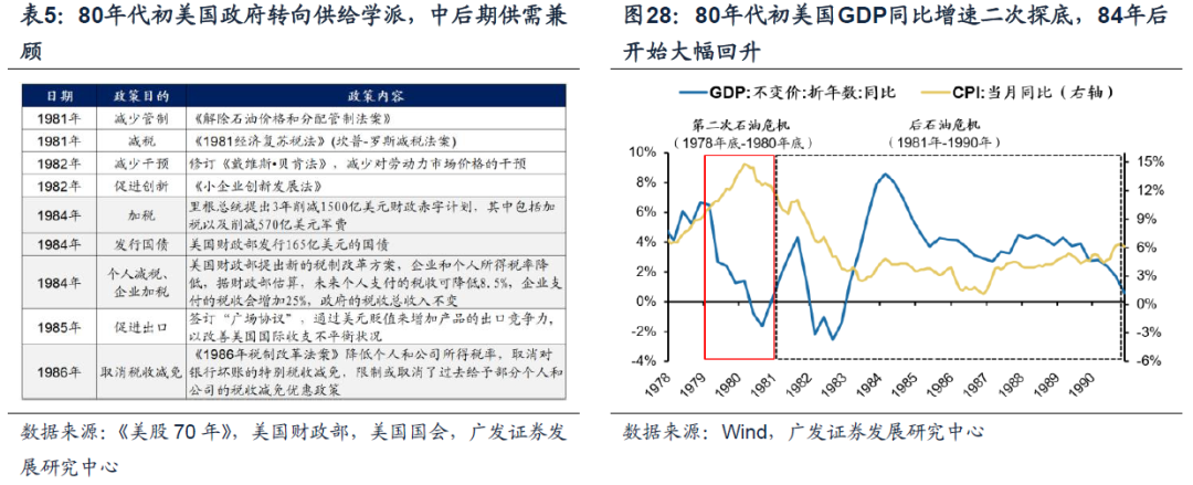 里根政府转向“供给学派”是80年代美国经济走出滞胀的表象。70年代“凯恩斯主义”下的需求端无序刺激,反而对美国制造业形成“挤出效应”,加剧美国滞胀压力。80年代初里根政府转向“供给学派”,但仅考虑供给而忽视需求,导致美国经济在80年代初“二次探底”。83年以后,里根政府在重视“供给”的同时兼顾“需求”,美国经济才最终走出滞胀阴影。
