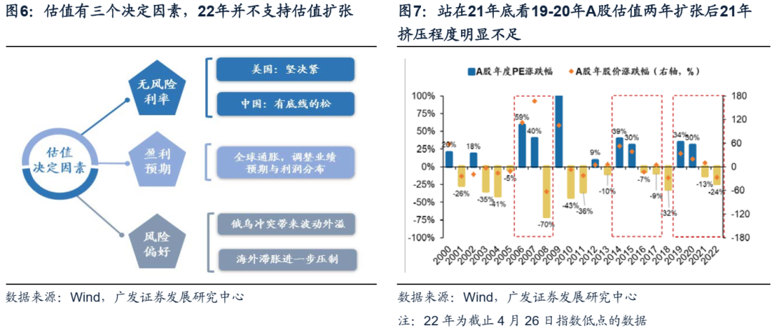 第二,简单用货币信用框架研判估值、而忽视了估值有三个决定因素。简单沿用货币信用框架,误认为货币信用友好就会支撑估值扩张;但实则估值有三个决定因素(实际无风险利率、盈利预期、风险偏好),22年“美国坚决紧+中国有底线的松”,A股估值在19-20年连续2年扩张后21年的挤压程度明显不够,22年继续挤压。