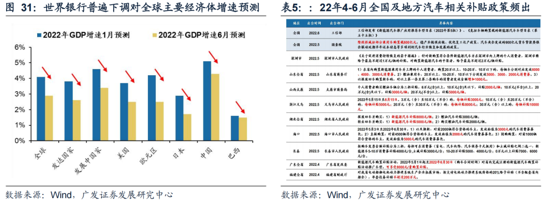 其中供需双向共振最确定的链条是汽车产业链(含新能源车):一方面,复工复产保障生产与制造链条的供给恢复。政府开通“绿色通道”,同时与重点“白名单”企业建立“一对一”关企联络机制。5月来看,上汽乘用车、上汽通用、上汽大众、特斯拉四家整车企业全面复工,基本实现连续稳定生产,每天下线整车约2000辆,带动上下游1100多家零部件配套企业恢复生产。同时,以汽车全钢胎开工率来观测,截至6月16日,开工率达58.97%,已基本恢复至去年同期水准。另一方面,购置税减免及汽车下乡保障了需求。5月以来汽车促消费政策频出,如5月23日国务院放宽汽车限购、阶段性减征部分乘用车购置税600亿元,6月17日新能源汽车下乡活动首站在江苏昆山举行。供需双向提振下,汽车5月数据恢复明显,产销增速分别录得-4.8%、-12.6%,环比抬升38.7pct、35.0pct。据广发汽车预测,本次政策对22年乘用车销量弹性影响约为5%-10%,22年乘用车终端销量增速中枢为5%。