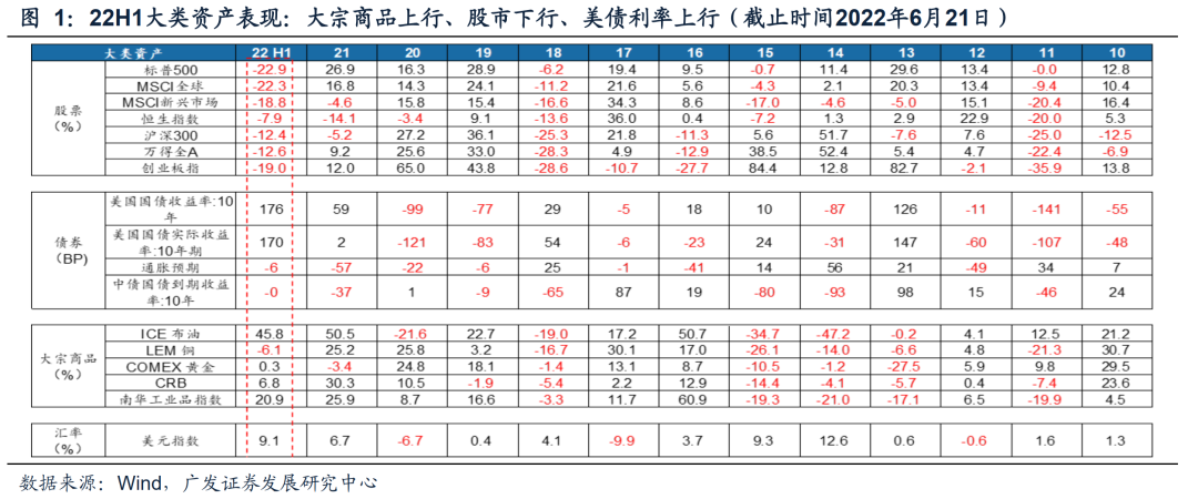 年度策略展望《慎思笃行》中提出海外迎来罕见的“滞胀+收紧”组合,22H1大类资产验证。22H2大类资产受“紧缩”和“衰退”共振影响,而非单边主导,大类资产将呈现美债利率将延续上行,大宗商品震荡分化,美股仍有下行压力的组合。