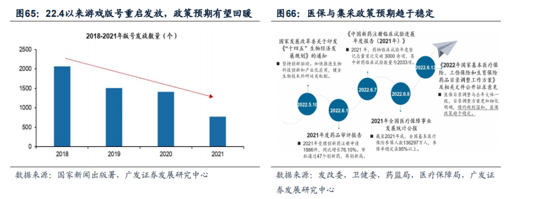前期的压制性政策边际宽松,政策预期转暖,受益行业如互联网传媒、创新药等。(1)互联网传媒:2022年4月29日中央政治局针对互联网平台公司的政策在表述上由此前的“反垄断”“防止无序扩张”“红绿灯”等正式调整为“健康发展”,政策释放出较强的积极信号。据国家新闻出版署数据,2018-2021年下发的游戏版号数量逐年下滑,2022年4月在时隔8个月后游戏版号重启发放,45款网络游戏获批,随后6月7日再度发放第二批游戏版号,市场政策预期向好。(2)创新药:6.13公布的《2022年国家基本医疗保险、工伤保险和生育保险药品目录调整工作方案》意见稿显示最新医保目录调整与去年大体一致,方案上更加细化明确。近期药品集采续约的平均降价幅度较此前集采总体温和,行业政策预期趋于稳定和回暖,常态化集采客观上有望促进药企现金流边际改善与创新药业务研发。6月1日国家药监局发布的《2021年度药品审评报告》显示全年创新药注册申请数同比高增76.1%,审批通过47个创新药,再创新高。