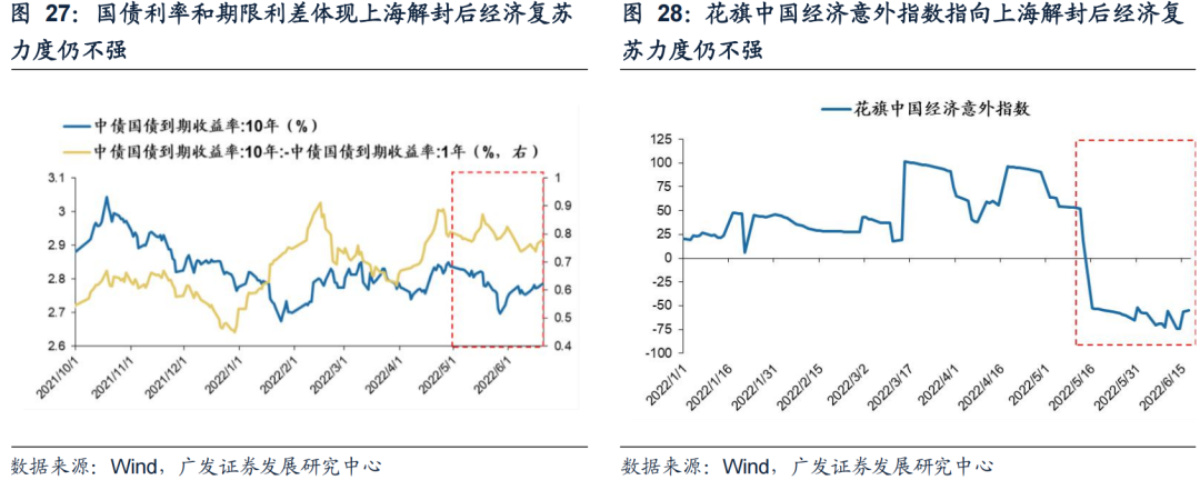 22H1国内复苏力度整体低于预期,22H2经济是否超预期取决于地产。1-4月,“有底线的稳增长”+“疫情管控逐渐趋严”组合下,国内经济弱于市场预期;4.29政治局会议后,稳增长和疫情防控政策取得平衡,但从国债期限利差、10年期国债利率、花旗经济意外指数来看,5月以来经济的复苏力度也未超市场预期。
