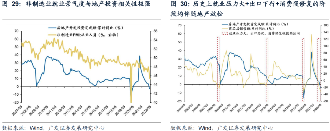 “稳就业”与“稳地产”的相关性较强,地产有进一步放松的可能。历史来看非制造业就业景气度与地产投资相关性极强,我们认为“稳就业”避不开“稳地产”。历史上过去3次就业压力大+出口增速下行+消费修复比较慢的阶段(2008.10-2009.01,2015.02-2015.05,2019.12-2020.03)均伴随着地产放松周期。