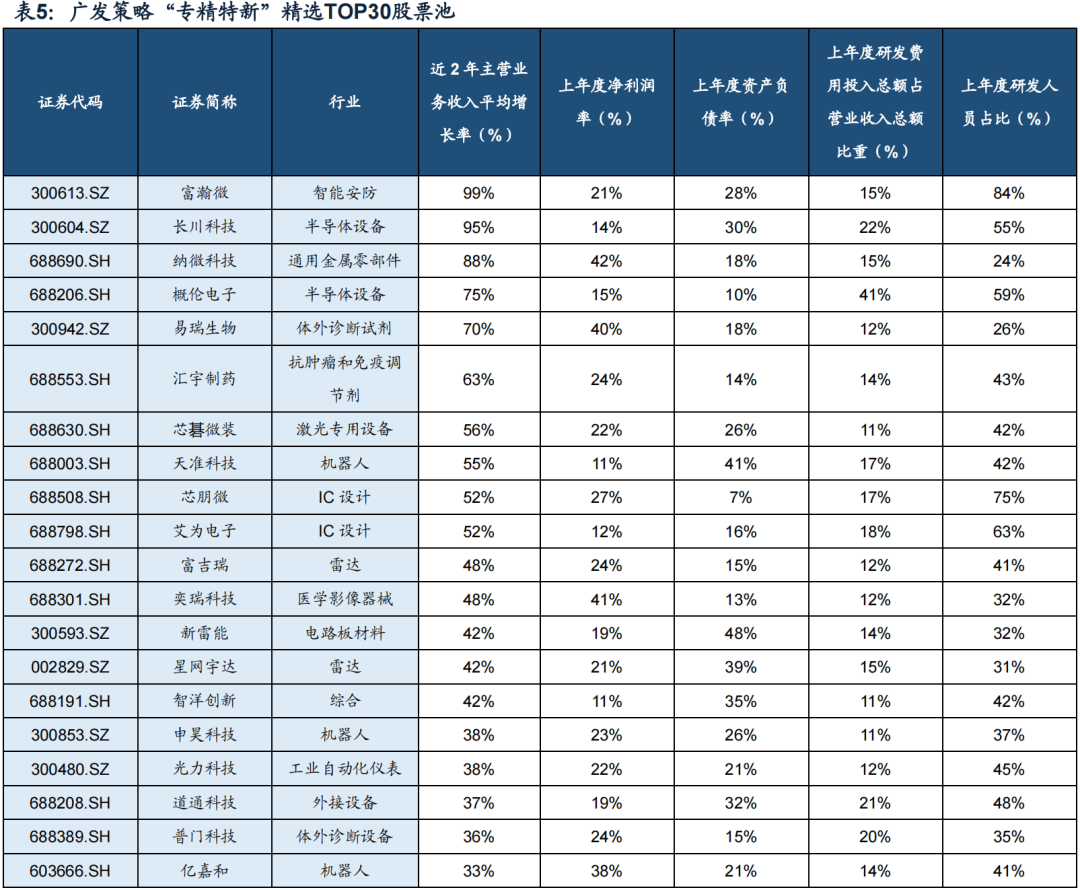 ● 五大核心指标精选“专精特新”股票池(附表):(1)近2年主营业务收入平均增长率达到15%;(2)上年度净利润率达到10%;(3)上年度资产负债率50%以下;(4)上年度研发费用投入总额占营业收入总额比重达到10%;(5)上年度研发人员占比达到20%。